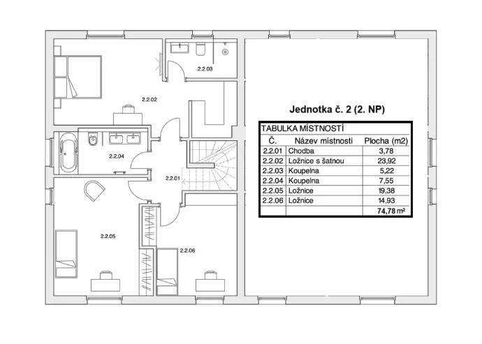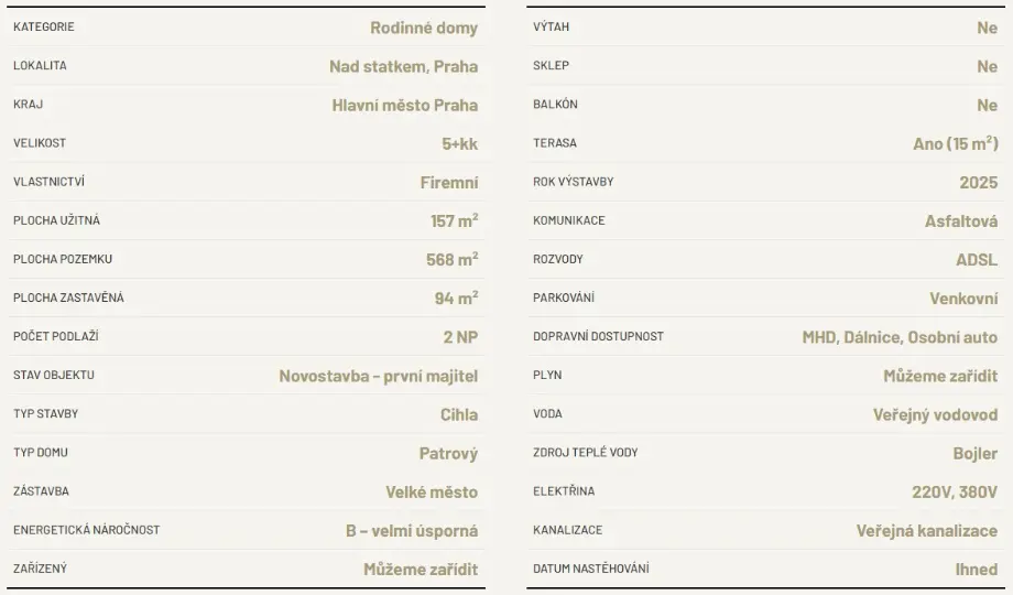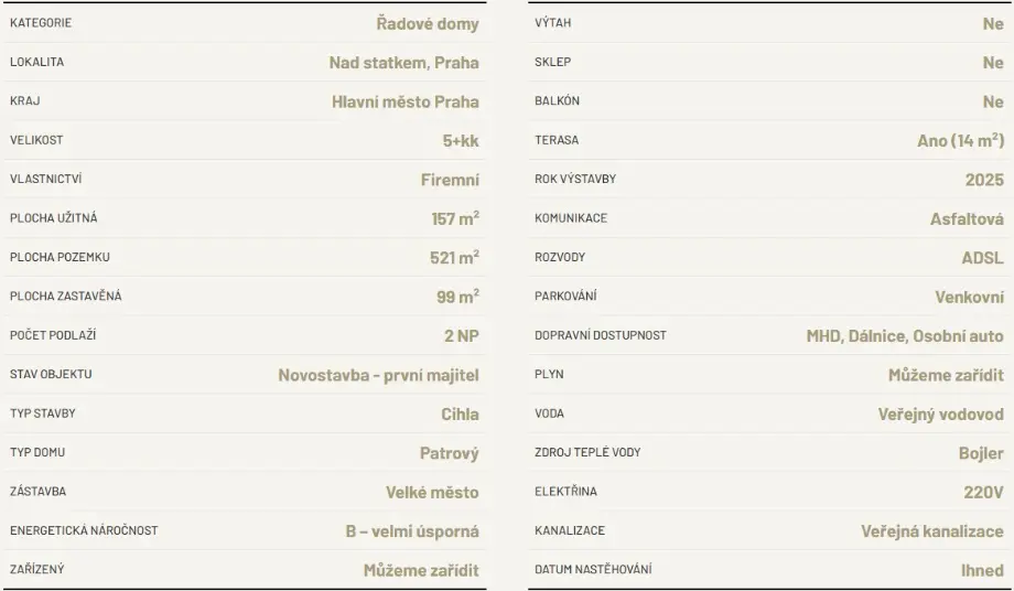 Váš budoucí domov je navržen tak, aby splňoval požadavky na moderní a komfortní bydlení. Každá bytová jednotka má prostornou dispozici 5+KK o celkové podlahové ploše 157 m² a rozkládá se ve dvou nadzemních podlažích s podkrovím pro uložení sezónních věcí. Součástí jednotky je vlastní zahrada a parkovací stání. Dům je napojen na inženýrské sítě: elektřiny, vody a kanalizace. Každá jednotka má vlastní měřidla pro plnou nezávislost. Nyní je stavba ve fázi 'whitebox', tedy máte možnost vlastní volby účelu místností, zejména pokud jde o šatny, pracovny nebo koupelny - konfigurace těchto prvků je nyní na vás. Více informací vám poskytne makléř.